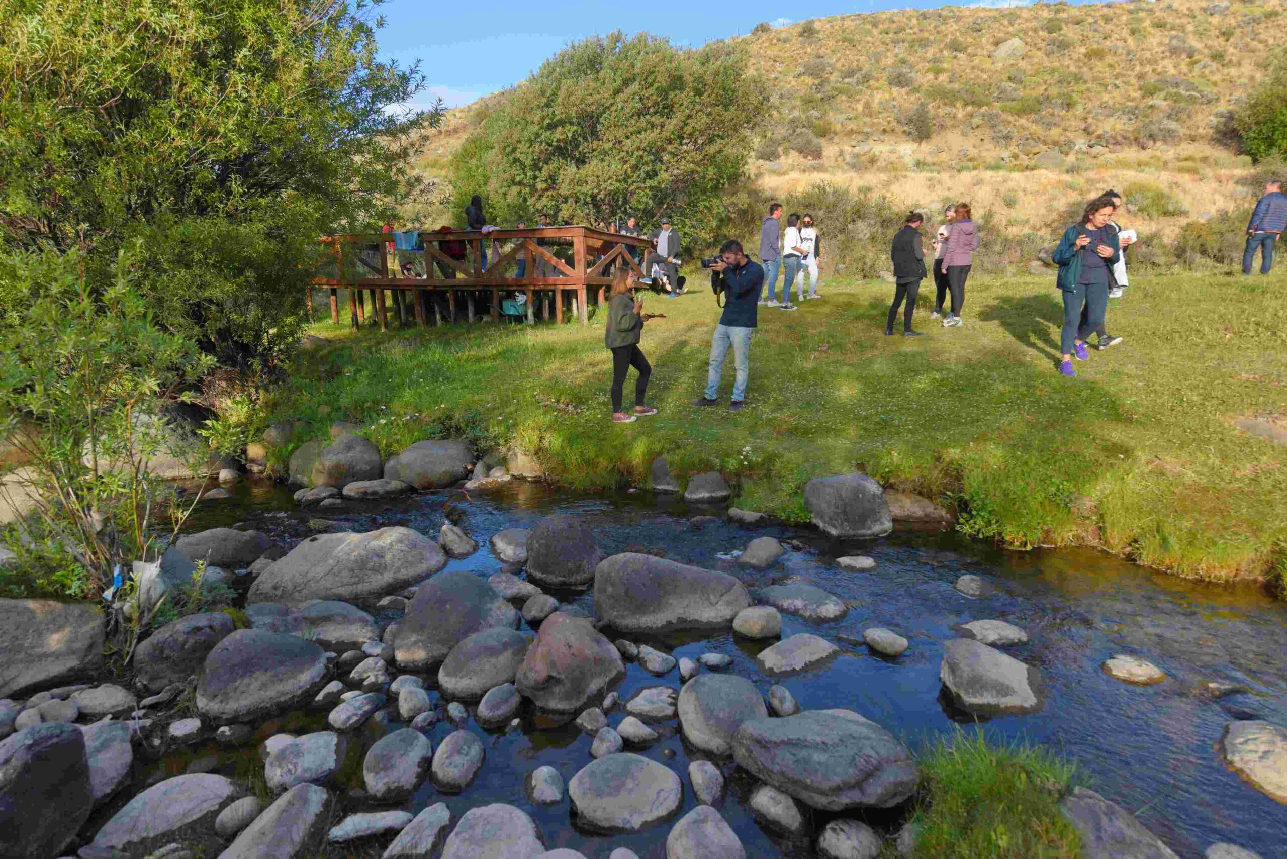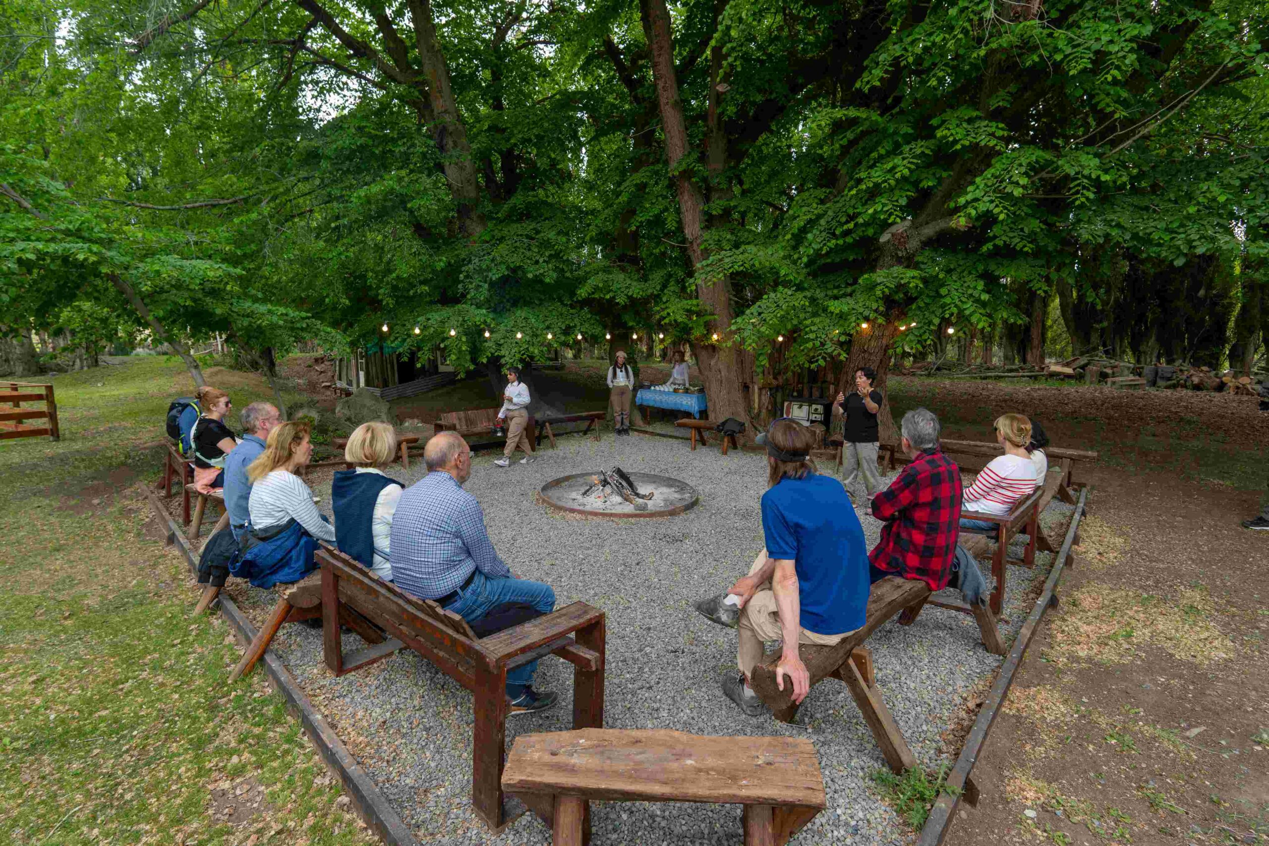 The walk concludes with a “Patagonian wine tasting” by the stream, and on the way back, the organic gardens and plant nursery are visited.