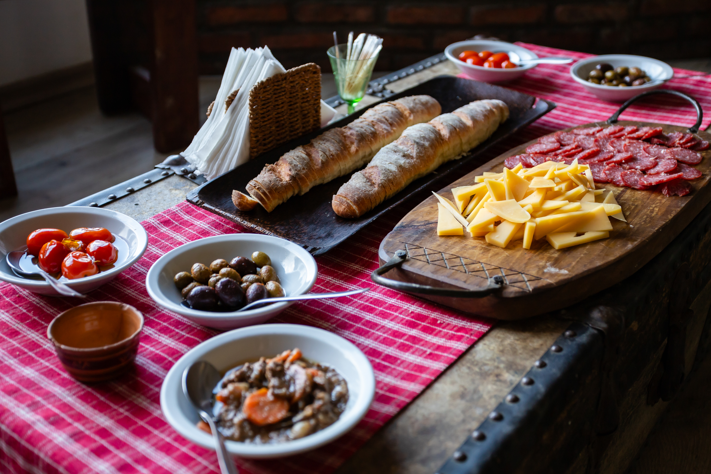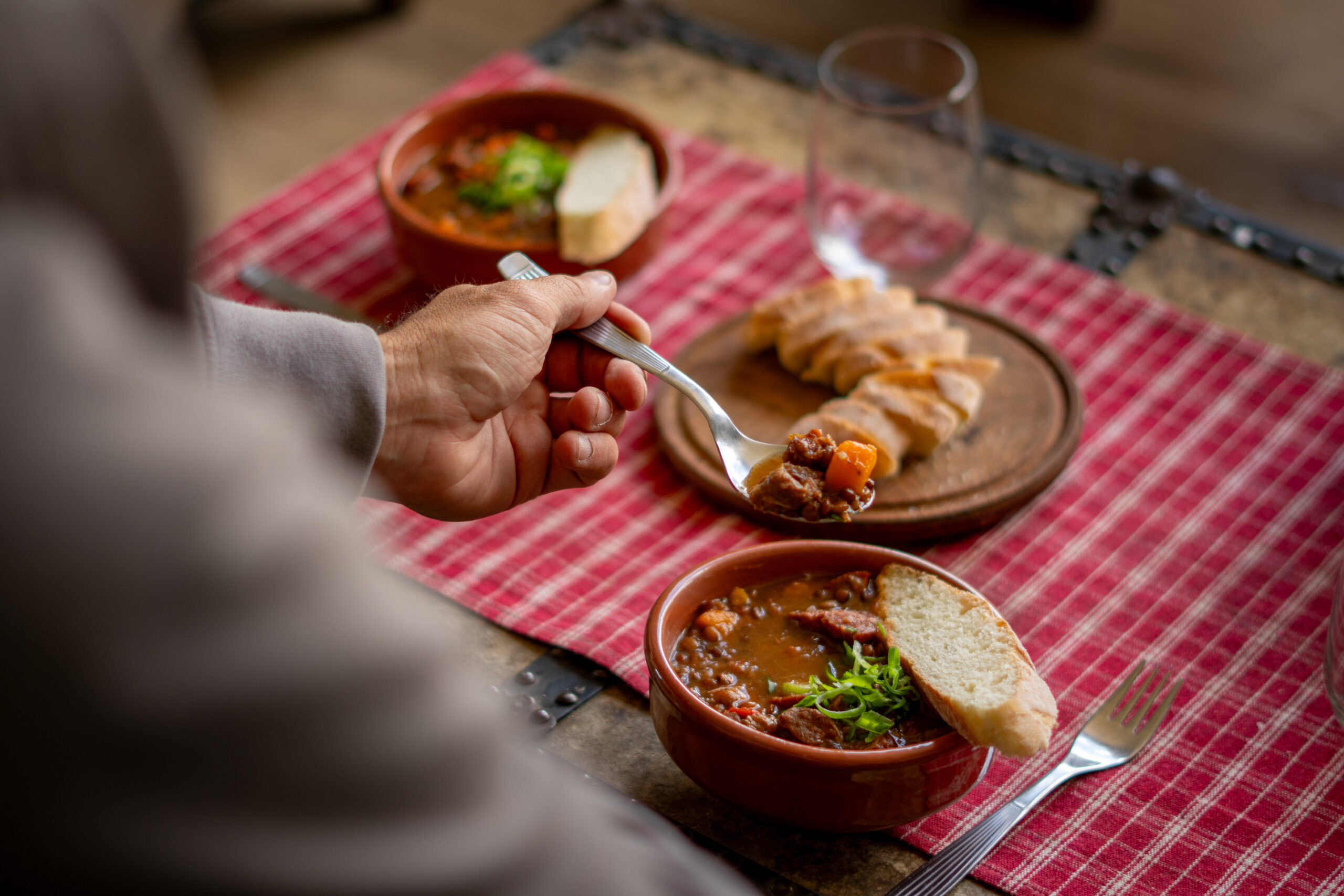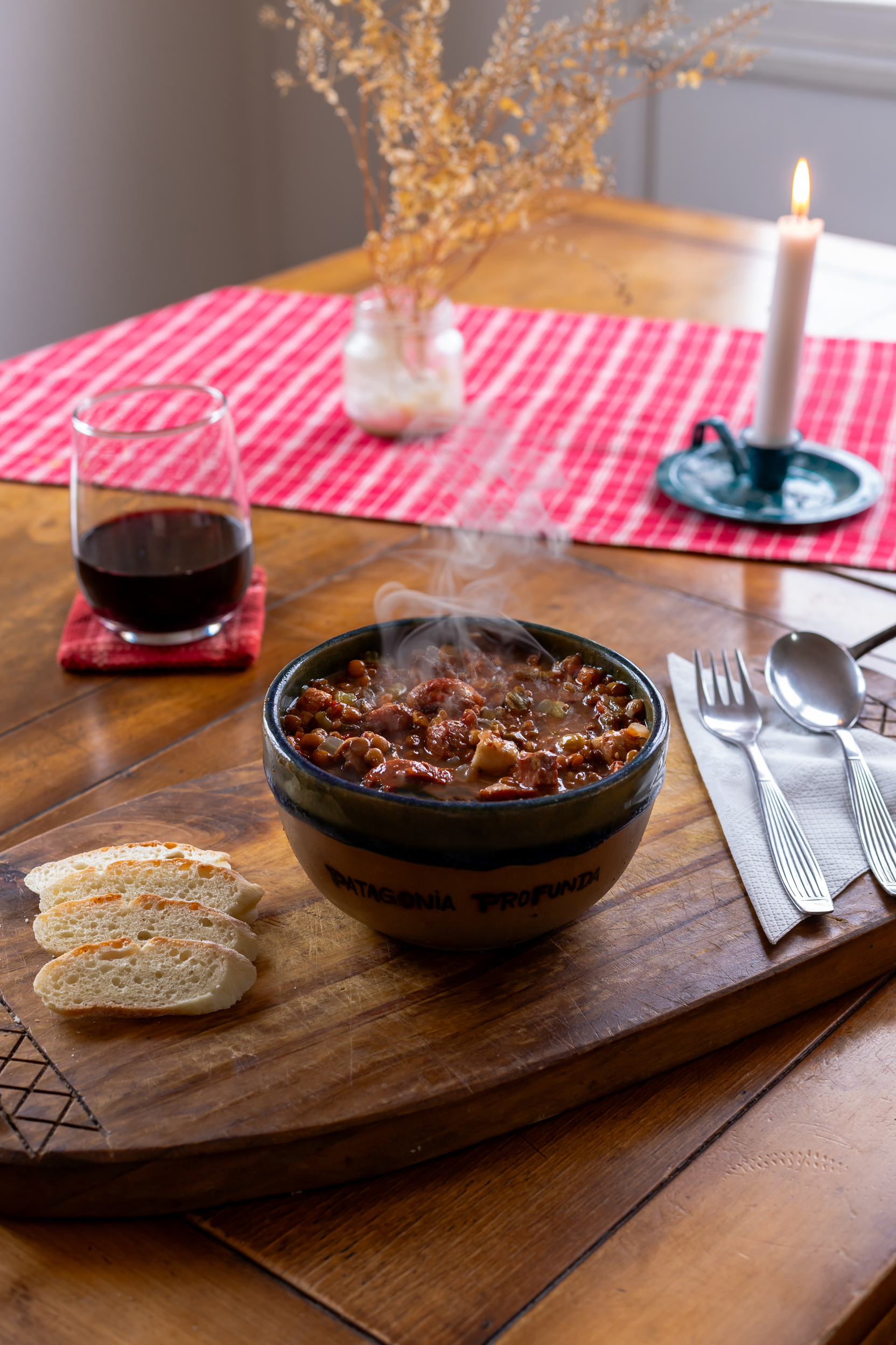 The meal includes a picada (appetizer), lentejas stew, cheesecake, and beverages.