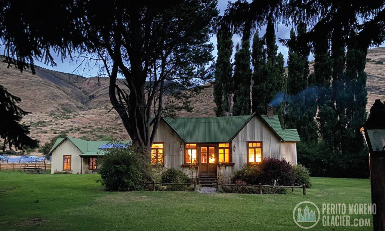 The house preserves its original architecture, with solid walls, wooden ceilings, and large windows overlooking the southern arm of Lake Argentino and the Patagonian steppe.