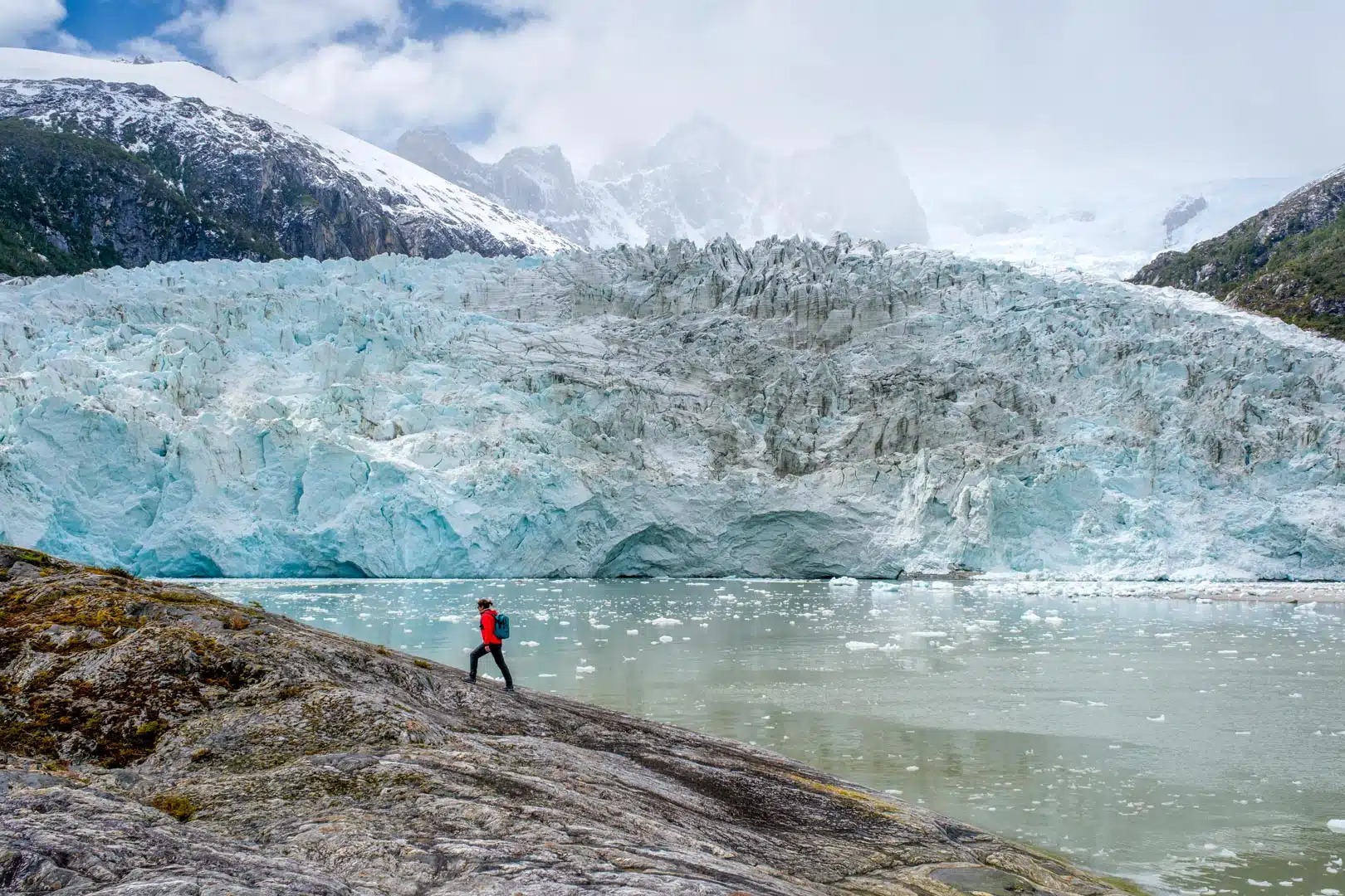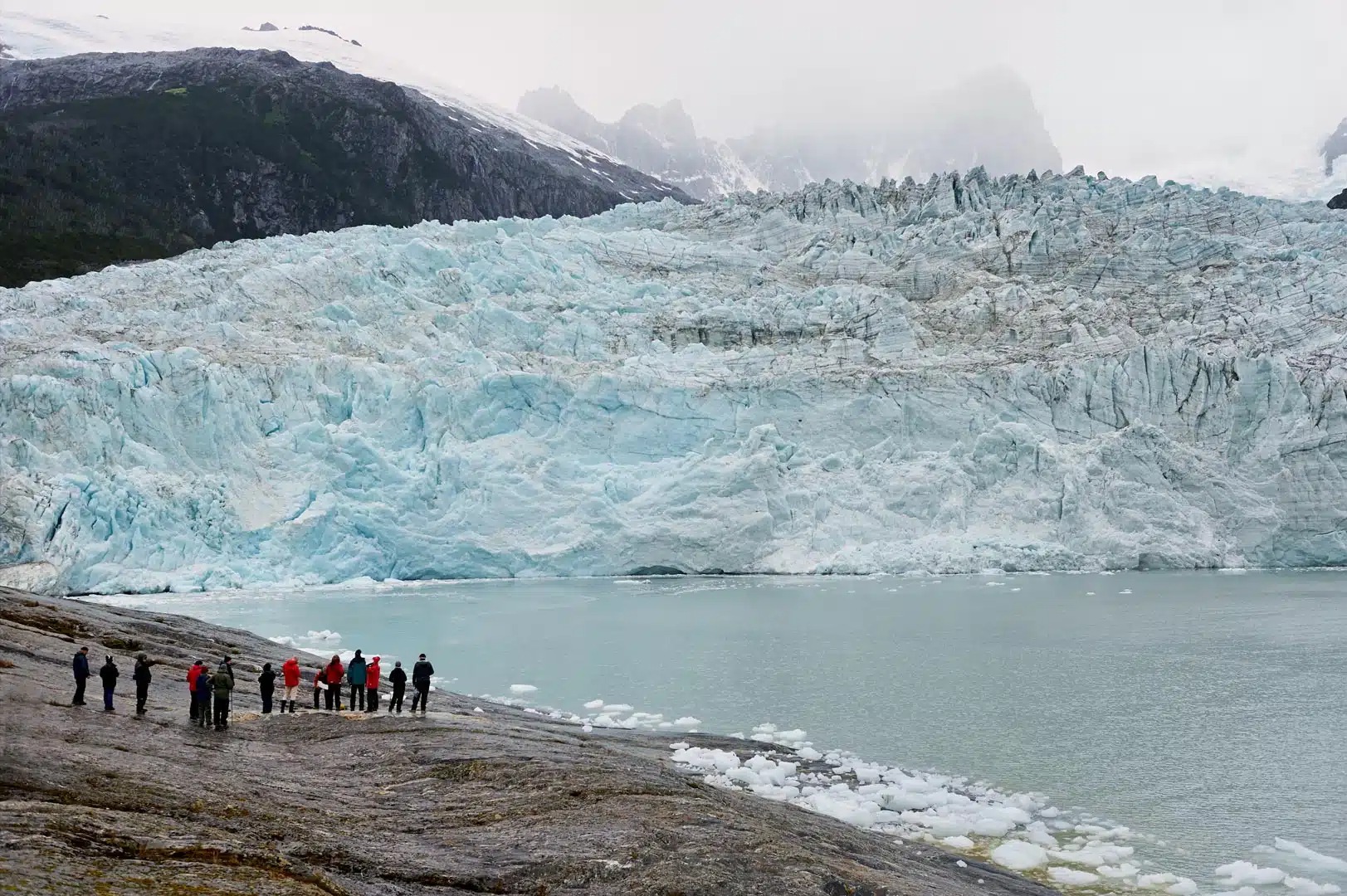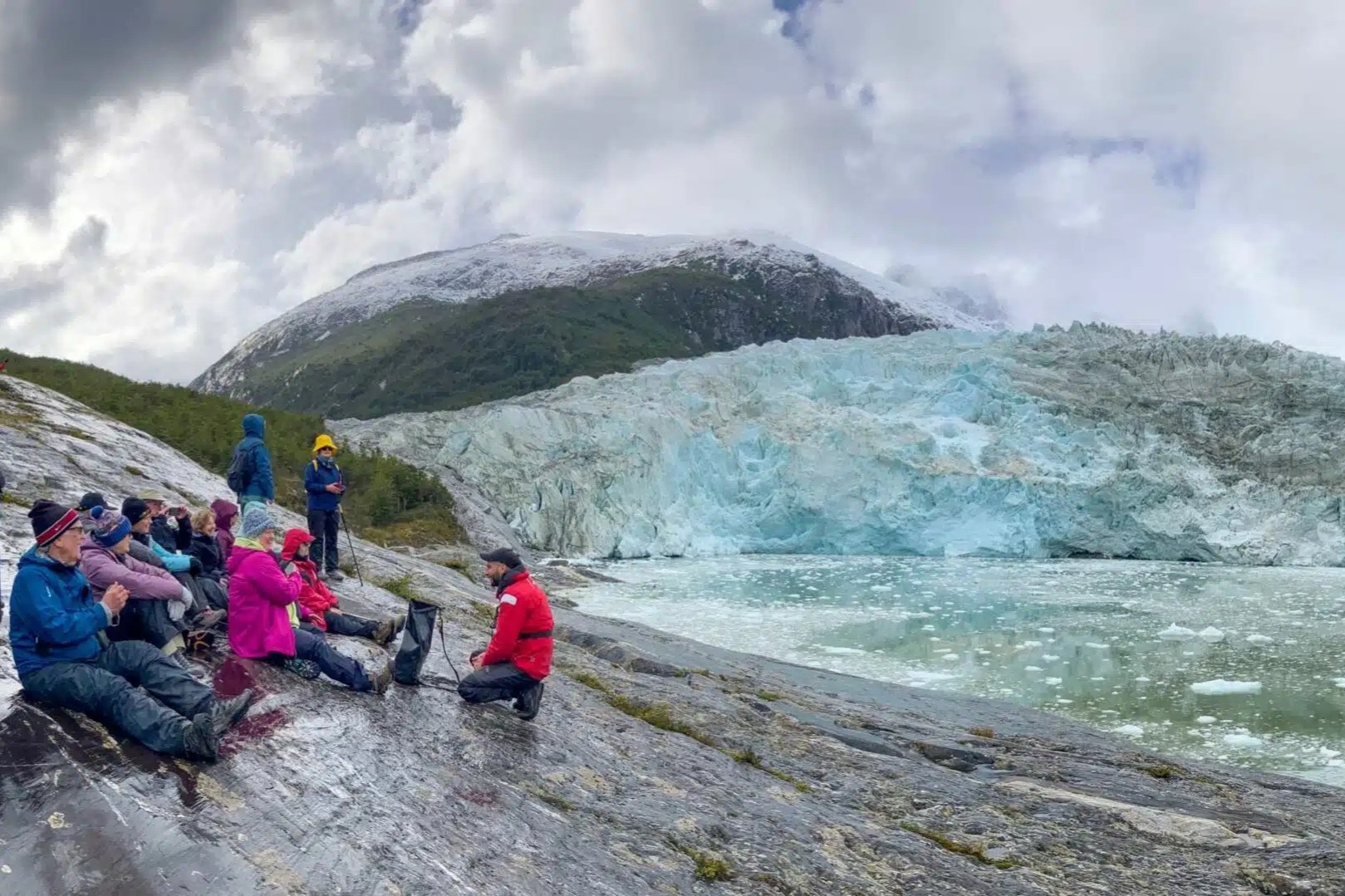 Passengers disembark for a walk near a lagoon formed by the melting of Aguila Glacier, reaching viewpoints that offer impressive perspectives of the glacier and surrounding landscape.