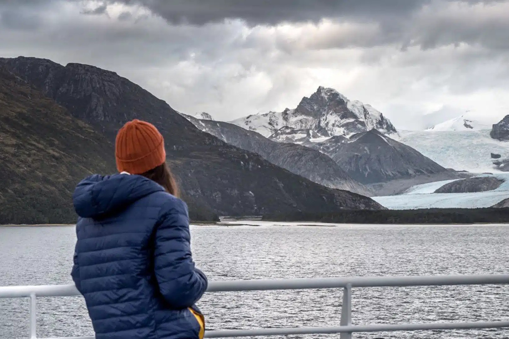 The ship enters the Cockburn Channel and continues into Agostini Sound, where glaciers from the Darwin Mountain Range descend toward the sea.